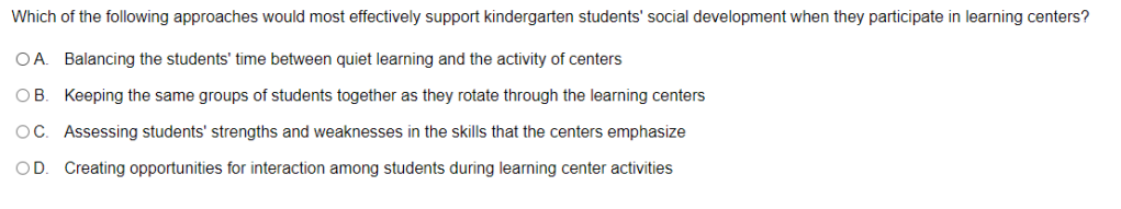 First, let’s break down the question. Keywords I see are “support kindergarten students’ social development” “learning centers”. Show I know I show be looking for an answer to support this.